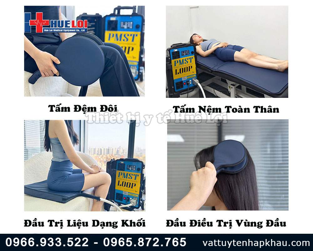 +) Trang bị đa dạng các đầu điều trị gồm thảm toàn thân, đầu phát tại chỗ hoặc đầu phát dạng vòng, giúp linh hoạt điều trị các vùng cơ thể khác nhau — từ những điểm nhỏ như khớp, cổ tay đến các vùng lớn như lưng, chi hoặc toàn thân.